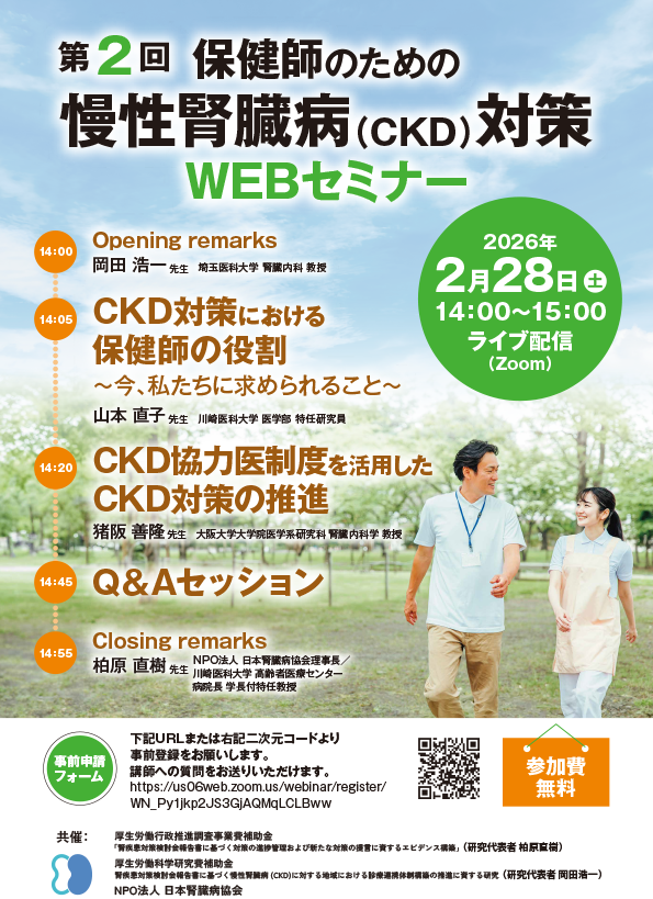 この度、保健師の方に向けて慢性腎臓病(CKD)対策に関するWebセミナーを開催いたします。